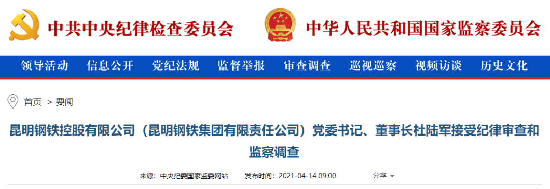 中央紀委國家監(jiān)委網(wǎng)站訊 據(jù)云南省紀委監(jiān)委消息:昆明鋼鐵控股有限公司(昆明鋼鐵集團有限責任公司)黨委書記、董事長杜陸軍涉嫌嚴重違紀違法,目前正在接受紀律審查和監(jiān)察調(diào)查。