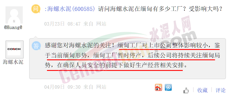 據(jù)水泥人網(wǎng)此前報道,海螺水泥(600585)在互動平臺回復(fù)投資者提問時表示,鑒于緬甸局勢動蕩,為保證工廠和公司員工安全,緬甸地區(qū)工廠暫時停產(chǎn)。