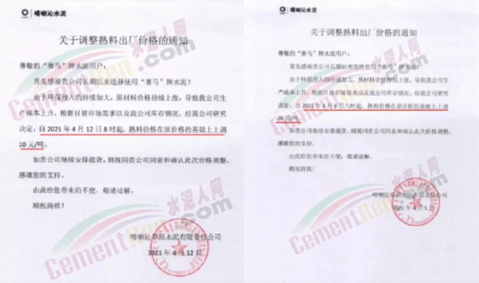 七日之內(nèi)兩次上調(diào)熟料價格,累計漲價30元/噸。企業(yè)調(diào)價函提到,由于環(huán)保投入的持續(xù)加大,原材料價格持續(xù)上漲,導(dǎo)致公司生產(chǎn)成本上升。