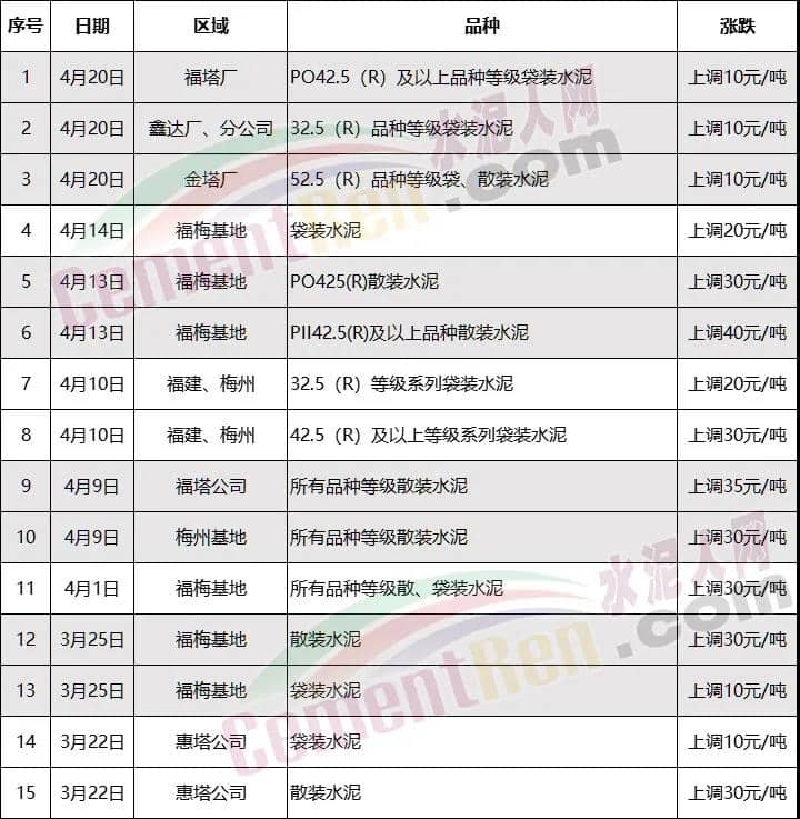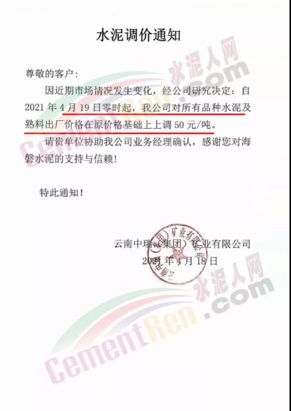 福建泊安建材通知,根據(jù)當(dāng)前水泥市場(chǎng)行情,各水泥企業(yè)相繼上調(diào)價(jià)格的背景下,公司已接廠家通知∶“跟隨其他水泥企業(yè)于2021年4月20日0時(shí)起,各品種各規(guī)格型號(hào)水泥,在原價(jià)格基礎(chǔ)上上調(diào)相應(yīng)價(jià)格!”