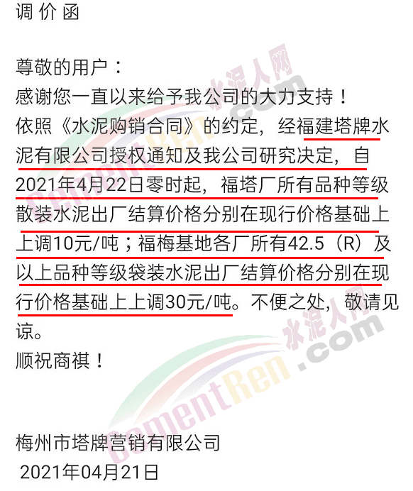 水泥人網(wǎng)通訊員消息 :4月21日梅州市塔牌營銷有限公司再一發(fā)函漲價。漲價通知稱,依照《水泥購銷合同》的約定,經(jīng)福建塔牌水泥有限公司授權(quán)通知及公司研究決定,自 2021年4月22日零時起,福塔廠所有品種等級散裝水泥出廠結(jié)算價格分別在現(xiàn)行價格基礎上上調(diào)10元/噸;福梅基地各廠所有42.5(R)及以上品種等級袋裝水泥出廠結(jié)算價格分別在現(xiàn)行價格基礎上上調(diào)30元/噸。據(jù)水泥人網(wǎng)了解,這已經(jīng)是該企業(yè)近一個月內(nèi)發(fā)布的第9份漲價函了。