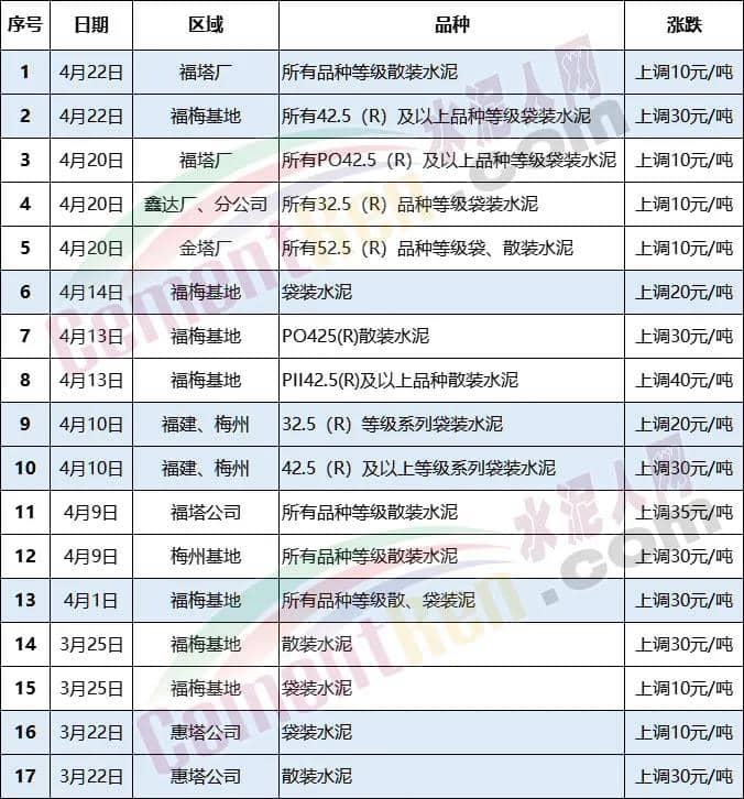 4月21日梅州皇馬水泥有限公司通知根據(jù)市場情況的變化,經(jīng)公司研究決定,從 2021年4月22日零時起,P.O42.5及以上等級袋裝水泥出廠價格分別在原價格基礎上上調(diào)30元/噸。