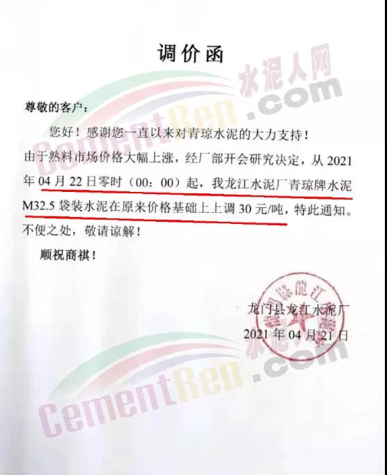 龍門縣龍江水泥通知,自4月22日0時起,龍江水泥青瓊牌水泥M32.5袋裝上調(diào) 30元/噸。