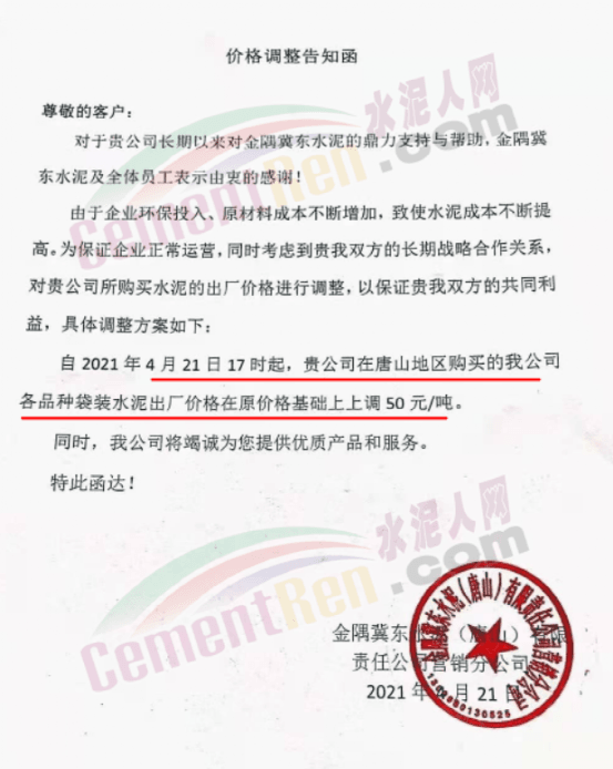 日前,金隅冀東水泥唐山有限責任公司營銷分公司通知,由于企業(yè)環(huán)保投入、原材料成本不斷增加,致使企業(yè)水泥成本不斷提高。為保證企業(yè)正常運營,自 4月 21日 17 時起,金隅冀東水泥唐山地區(qū)各品種袋裝水泥出廠價格在原價格基礎上上調(diào) 50 元/噸。