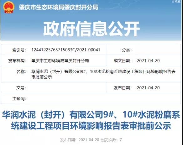 4月20日,廣東省肇慶市生態(tài)環(huán)境局肇慶封開分局發(fā)布《華潤水泥(封開)有限公司9#、10#水泥粉磨系統(tǒng)建設(shè)工程項目環(huán)境影響報告表審批前公示》提到華潤水泥(封開)有限公司次將新建兩條水泥粉磨(9#、10#)生產(chǎn)線。