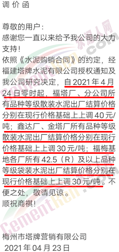 梅州市塔牌營銷有限公司通知,依照《水泥購銷合同》的約定,經(jīng)福建塔牌水泥有限公司授權(quán)通知及我公司研究決定,自4月24日零時起,福塔廠、分公司所有品種等級散裝水泥出廠結(jié)算價格分別在現(xiàn)行價格基礎(chǔ)上上調(diào)40元/噸;鑫達(dá)廠、金塔廠所有品種等級散裝水泥出廠結(jié)算價格分別在現(xiàn)行價格基礎(chǔ)上上調(diào)30元/噸;福梅基地各廠所有42.5(R)及以上品種等級袋裝水泥出廠結(jié)算價格分別在現(xiàn)行價格基礎(chǔ)上上調(diào)30元/噸。