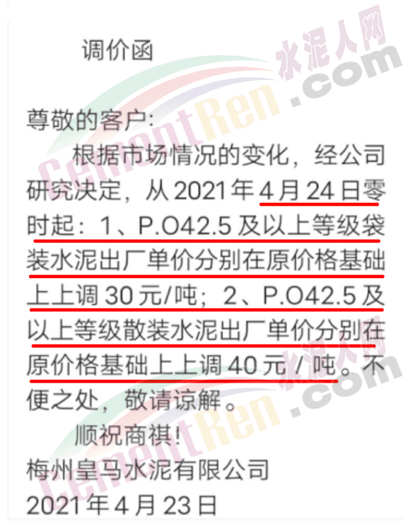 梅州皇馬水泥有限公司通知,從2021年4月24日零時起,P.O42.5及以上等級袋裝水泥出廠單價分別在原價格基礎(chǔ)上上調(diào)30元/噸;P.O42.5及以上等級散裝水泥出廠單價分別在原價格基礎(chǔ)上上調(diào)40元/噸。