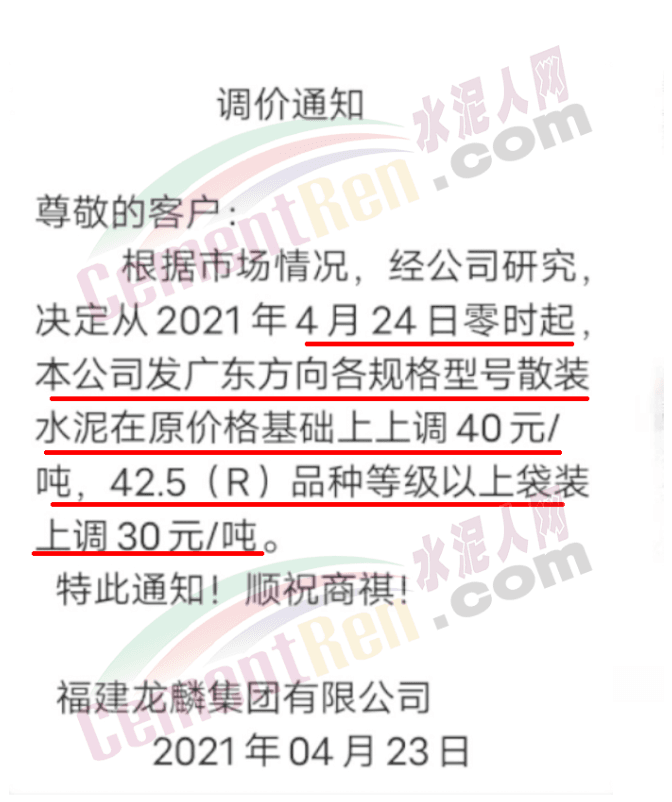 福建龍麟集團(tuán)有限公司通知從4月24日零時起,發(fā)廣東方向各規(guī)格型號散裝水泥在原價格基礎(chǔ)上上調(diào)40元/噸,42.5(R)品種等級以上袋裝上調(diào)30元/噸。