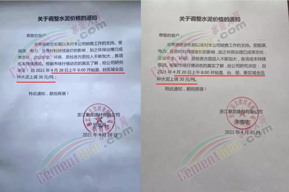 4月20日上午8∶00開始溫、臺、麗、衢區(qū)域全品種水泥上調30元/噸。