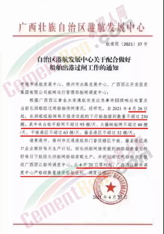 也正因如此,航道對于外來水泥的起到了至關重要的作用,近期廣西港航中心通知要求自4月26日起,長洲樞紐船閘每天接受適航的下行船舶報到數(shù)量不超過230艘、其中來自桂平船閘不超過95艘/天、大藤峽船閘不超過40艘/天、平南港區(qū)不超過63艘/天、藤縣港區(qū)不超過32艘/天。