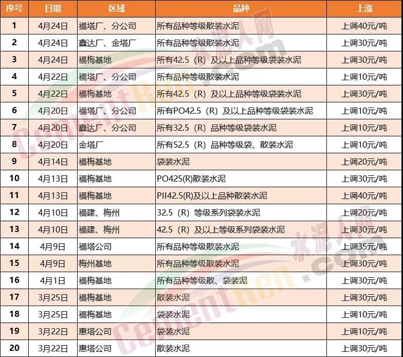 4月2日上午8∶00開始溫、臺、麗區(qū)域全品種水泥上調20元/噸。