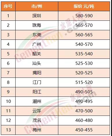 廣東省部分區(qū)域PO42.5散裝水泥報價