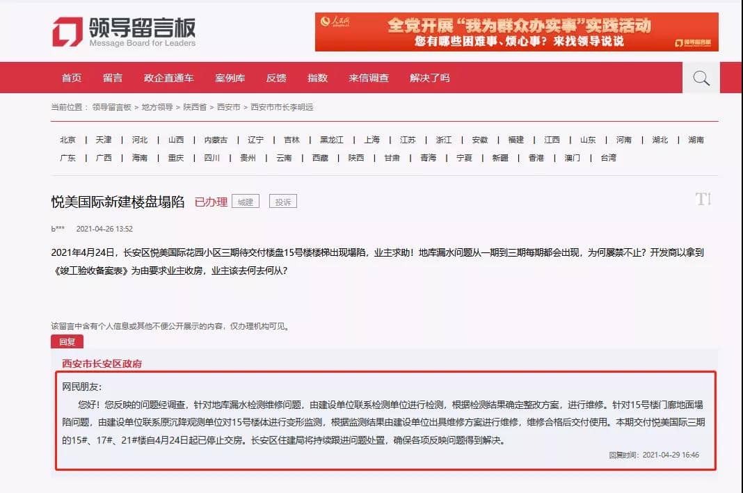 4月29日下午,西安市長(zhǎng)安區(qū)政府在領(lǐng)導(dǎo)留言板上作出答復(fù),內(nèi)容為“網(wǎng)民朋友:您好!您反映的問(wèn)題經(jīng)調(diào)查,針對(duì)地庫(kù)漏水檢測(cè)維修問(wèn)題,由建設(shè)單位聯(lián)系檢測(cè)單位進(jìn)行檢測(cè),根據(jù)檢測(cè)結(jié)果確定整改方案,進(jìn)行維修。針對(duì)15號(hào)樓門(mén)廊地面塌陷問(wèn)題,由建設(shè)單位聯(lián)系原沉降觀測(cè)單位對(duì)15號(hào)樓體進(jìn)行變形監(jiān)測(cè),根據(jù)監(jiān)測(cè)結(jié)果由建設(shè)單位出具維修方案進(jìn)行維修,維修合格后交付使用。本期交付悅美國(guó)際三期的15#、17#、21#樓自4月24日起已停止交房。長(zhǎng)安區(qū)住建局將持續(xù)跟進(jìn)問(wèn)題處置,確保各項(xiàng)反映問(wèn)題得到解決。”