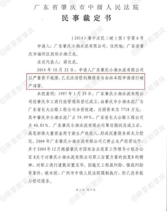 根據(jù)法院裁定書,廣東肇慶小湘水泥有限公司有賬面總資產(chǎn)26665931.24元,總負(fù)債349749519.84元,凈資產(chǎn)-323083588.60元,已嚴(yán)重資不抵債。無(wú)法清償?shù)狡趥鶆?wù)為由向本院申請(qǐng)進(jìn)行破產(chǎn)清算。