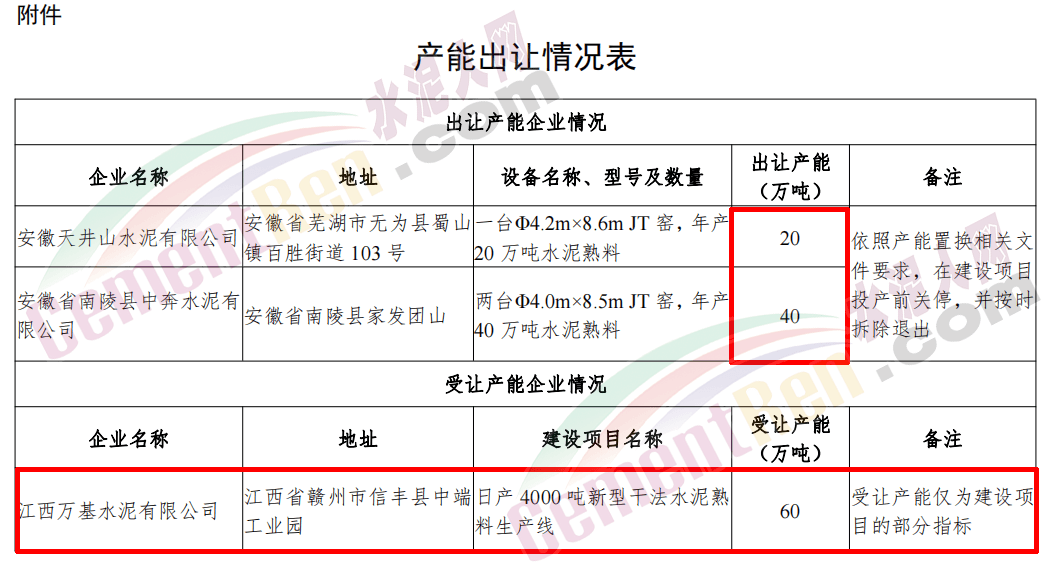 據(jù)水泥人網(wǎng)了解,2019年1月30日安徽省工信廳曾發(fā)布安徽天井山水泥有限公司和安徽省南陵縣中奔水泥有限公司水泥熟料生產(chǎn)線產(chǎn)能出讓的公告。產(chǎn)能出讓情況表顯示,安徽天井山水泥一條水泥熟料生產(chǎn)線和安徽南陵縣中奔水泥兩條水泥熟料生產(chǎn)線產(chǎn)能退出產(chǎn)能為三臺JT窯年產(chǎn)能合計(jì)60萬噸。用于江西萬基水泥有限公司建設(shè)一條4000t/d水泥熟料生產(chǎn)線。