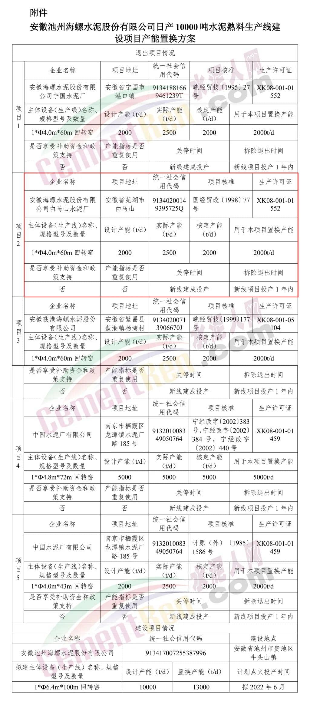 2020年7月,安徽省工信廳發(fā)布的一則產(chǎn)能置換方案中提到海螺水泥將通過退出包括安徽省蕪湖市的海螺水泥白馬山水泥廠2000t/d熟料生產(chǎn)線在內(nèi)的5個項(xiàng)目,用于在池州市境內(nèi)新建一條10000t/d熟料生產(chǎn)線。退出項(xiàng)目將在新線建成投產(chǎn)前關(guān)停,并于新線項(xiàng)目投產(chǎn)1年內(nèi)拆除。