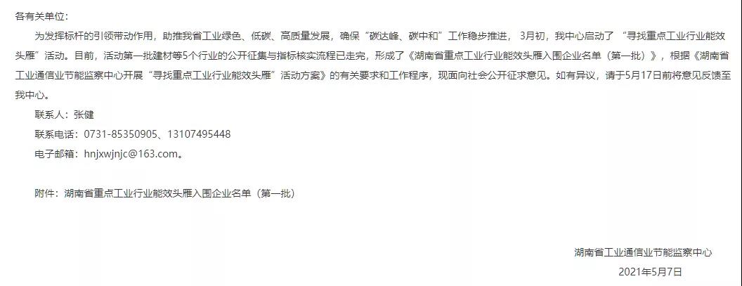 湖南省重點工業(yè)行業(yè)能效頭雁入圍企業(yè)名單(第一批)