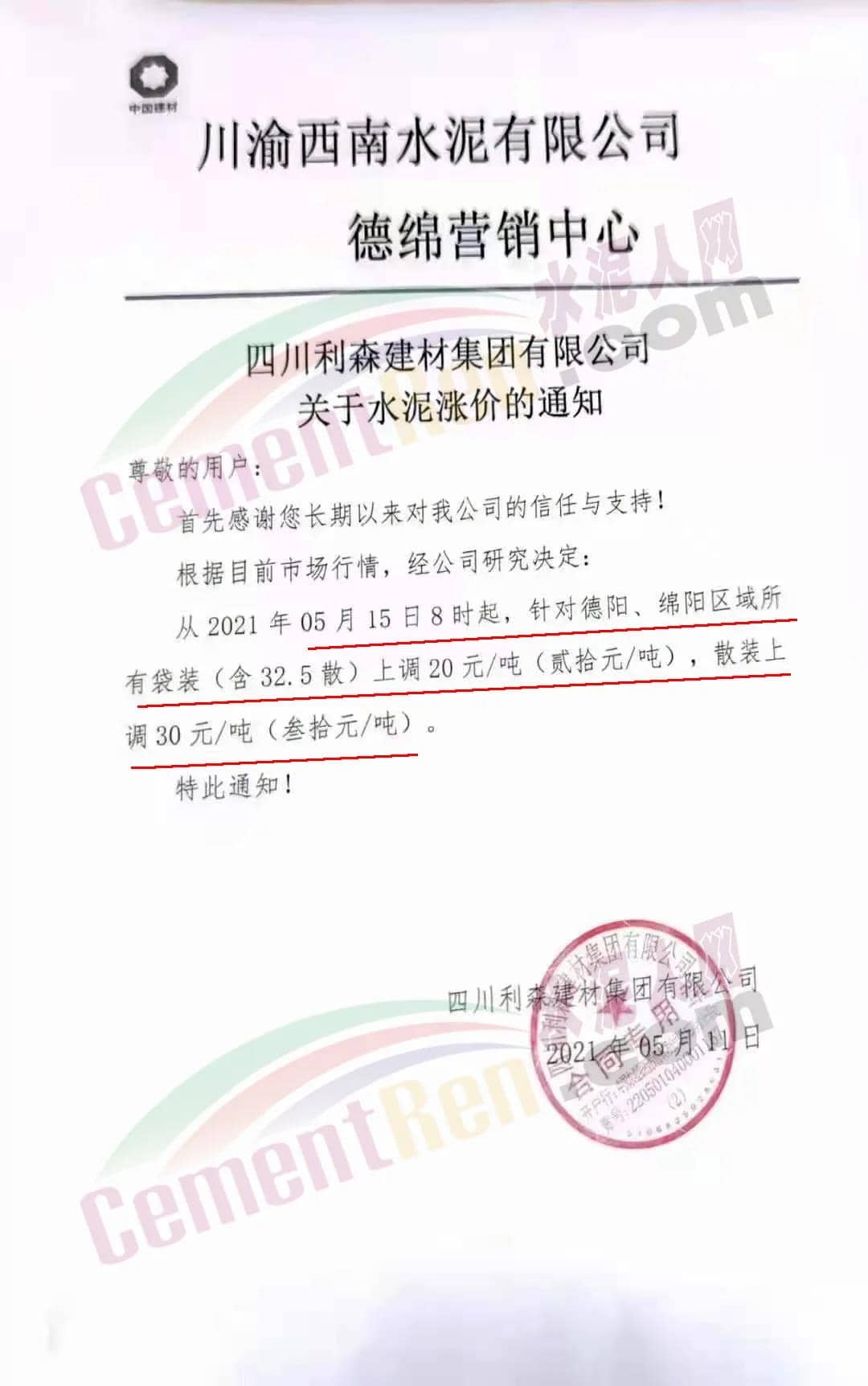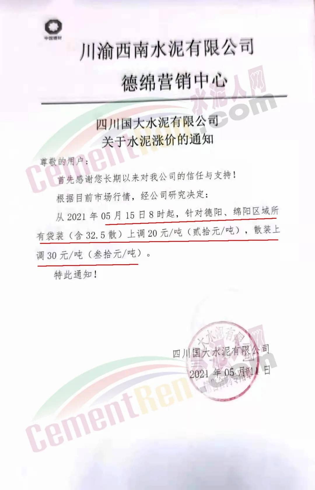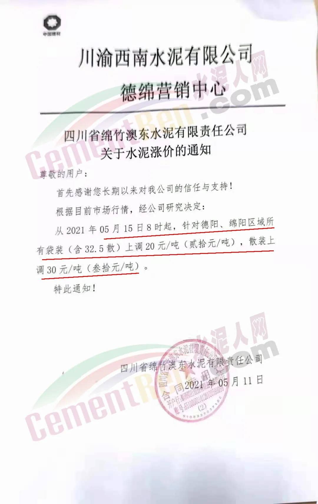 水泥人網(wǎng)通訊員消息 ,5月11日川渝西南水泥有限公司德綿營銷中心①羅江利森水泥有限公司、②四川省女媧建材有限公司、③四川省棉竹澳東水泥有限責(zé)任公司、④四川利森建材集團(tuán)有限公司、⑤四川國大水泥有限公司、⑥北川中聯(lián)水泥有限公司等六家企業(yè)集體發(fā)調(diào)價(jià)通知稱,根據(jù)目前市場(chǎng)行情,經(jīng)公司研究決定∶從 2021 年 5 月15 日 8 時(shí)起,針對(duì)德陽、綿陽區(qū)域所有袋裝(含 32.5散)上調(diào) 20元/噸(貳拾元/噸),散裝上調(diào) 30 元/噸(叁拾元/噸)。