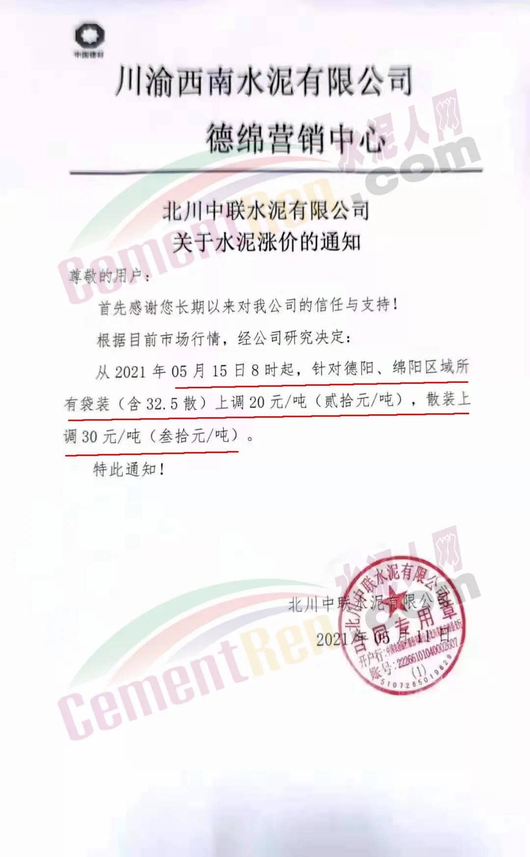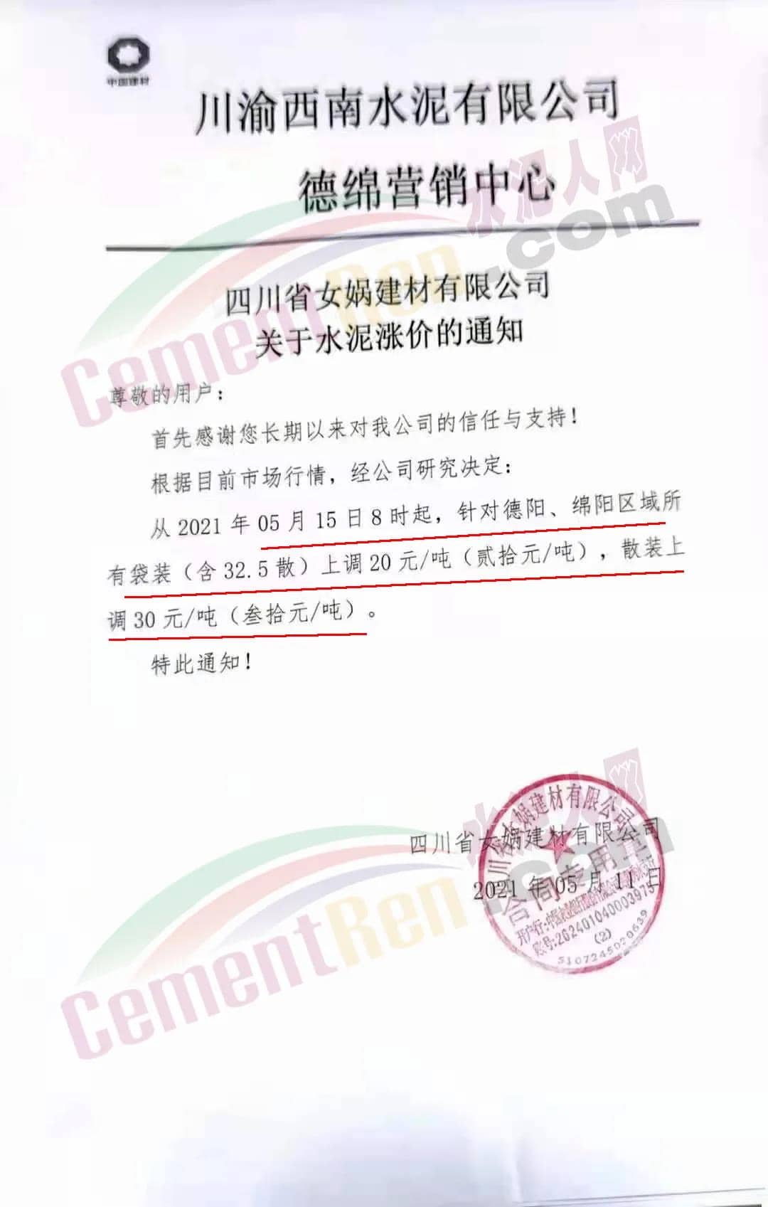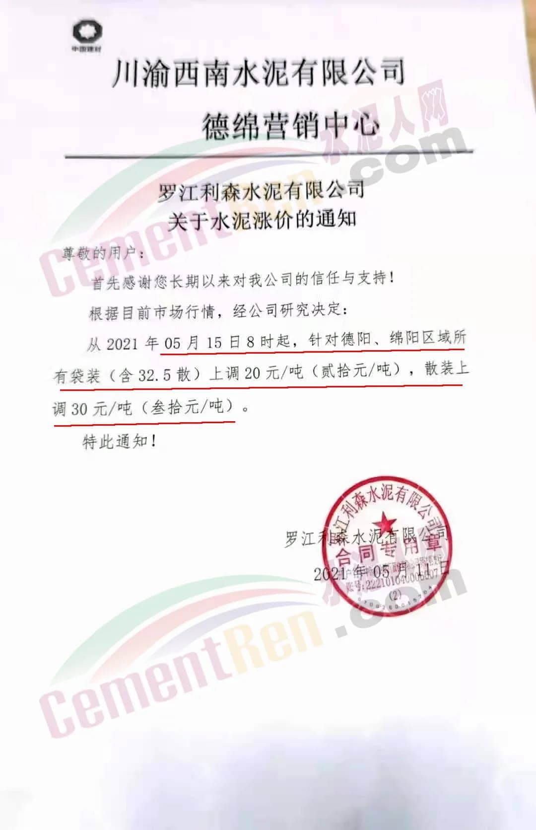 水泥人網(wǎng)通訊員消息 ,5月11日川渝西南水泥有限公司德綿營銷中心①羅江利森水泥有限公司、②四川省女媧建材有限公司、③四川省棉竹澳東水泥有限責(zé)任公司、④四川利森建材集團(tuán)有限公司、⑤四川國大水泥有限公司、⑥北川中聯(lián)水泥有限公司等六家企業(yè)集體發(fā)調(diào)價(jià)通知稱,根據(jù)目前市場(chǎng)行情,經(jīng)公司研究決定∶從 2021 年 5 月15 日 8 時(shí)起,針對(duì)德陽、綿陽區(qū)域所有袋裝(含 32.5散)上調(diào) 20元/噸(貳拾元/噸),散裝上調(diào) 30 元/噸(叁拾元/噸)。