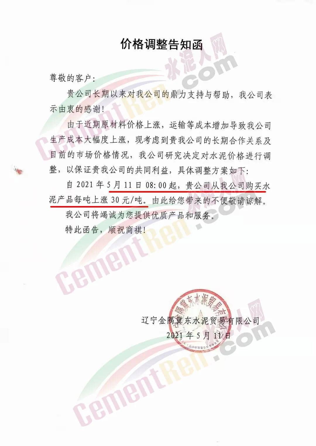 同日,東北區(qū)域的遼寧金隅冀東水泥貿(mào)易有限公司的通知稱,由于近期原材料價(jià)格上漲,運(yùn)輸?shù)瘸杀驹黾訉?dǎo)致我公司生產(chǎn)成本大幅度上漲,自 2021年5月11日08∶00起,貴公司從我公司購買水泥產(chǎn)品每噸上漲 30元/噸。