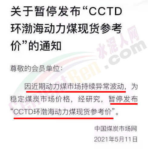 5月11日,中國(guó)煤炭市場(chǎng)網(wǎng)通知:“因近期煤市持續(xù)異常波動(dòng),為穩(wěn)定市場(chǎng)價(jià),經(jīng)研究,暫停發(fā)布環(huán)渤海動(dòng)力煤現(xiàn)貨參考價(jià)... ...”