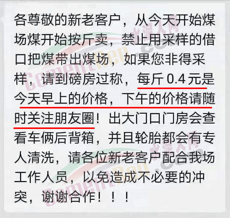 有煤場(chǎng)發(fā)消息稱:“各尊敬的新老客戶,從今天開(kāi)始煤場(chǎng)煤開(kāi)始按斤賣,禁止用采樣的借口把煤帶出煤場(chǎng),如果您非得采樣,請(qǐng)到磅房過(guò)稱,每斤0.4元是今天早上的價(jià)格,下午的價(jià)格請(qǐng)隨時(shí)關(guān)注朋友圈!出大門口門房會(huì)查看車倆(輛)后背箱,并且輪胎都會(huì)有專人清洗,請(qǐng)各位新老客戶配合我場(chǎng)工作人員,以免造成不必要的沖突,謝謝合作!!”