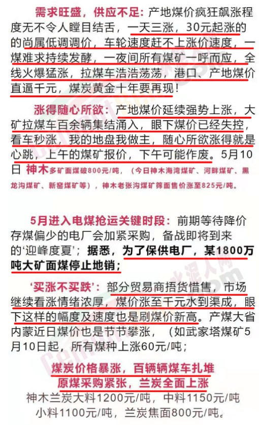 產(chǎn)地煤價(jià)瘋狂飆漲程度無(wú)不令人瞠目結(jié)舌,一天三漲,30元起的尚屬低調(diào)調(diào)價(jià),車輪速度趕不上漲價(jià)速度,一煤難求持續(xù)發(fā)酵,一夜間所有煤礦一呼而應(yīng),全線火爆猛漲,拉煤車浩浩蕩蕩,港口、產(chǎn)地煤直逼千元,煤炭黃金十年要再現(xiàn)!