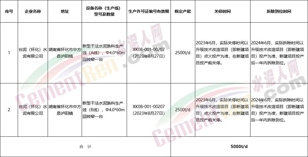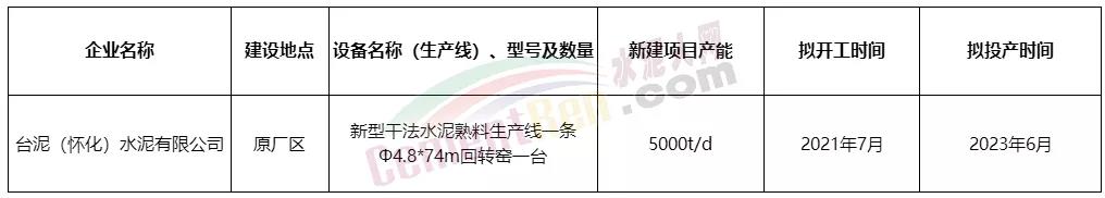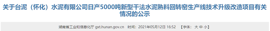5月12日湖南省工信廳發(fā)布《關于臺泥(懷化)水泥有限公司日產5000噸新型干法水泥熟料回轉窯生產線技術升級改造項目有關情況的公示》稱,臺泥(懷化)水泥有限公司擬在原廠區(qū)內實施智能化升級技術改造“合二為一”,建設一條日產5000噸新型干法水泥熟料回轉窯生產線,并將于2023年6月投產。