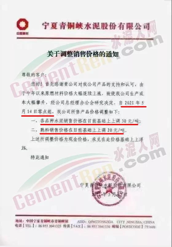 寧夏上峰萌生建材有限公司通知由于市場(chǎng)的變化,導(dǎo)致公司產(chǎn)品成本不斷上升,為了協(xié)同雙方的生產(chǎn)發(fā)展和保持良好的業(yè)務(wù)關(guān)系,根據(jù)原材料物價(jià)上漲的實(shí)際情況,經(jīng)公司領(lǐng)導(dǎo)研究決定,自2021年5月14 日早8∶00 起執(zhí)行,對(duì)公司各品種水泥銷售價(jià)格在原有基礎(chǔ)上上調(diào) 30 元/噸;熟料銷售價(jià)格在原有基礎(chǔ)上上調(diào) 20 元/噸。