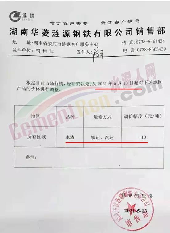 湖南華菱漣源鋼鐵有限公司銷售部通知,根據(jù)目前市場(chǎng)行情,經(jīng)研究決定,從5月13日起對(duì)所有區(qū)域鐵運(yùn)、汽運(yùn)水渣品種上調(diào)10元/噸。