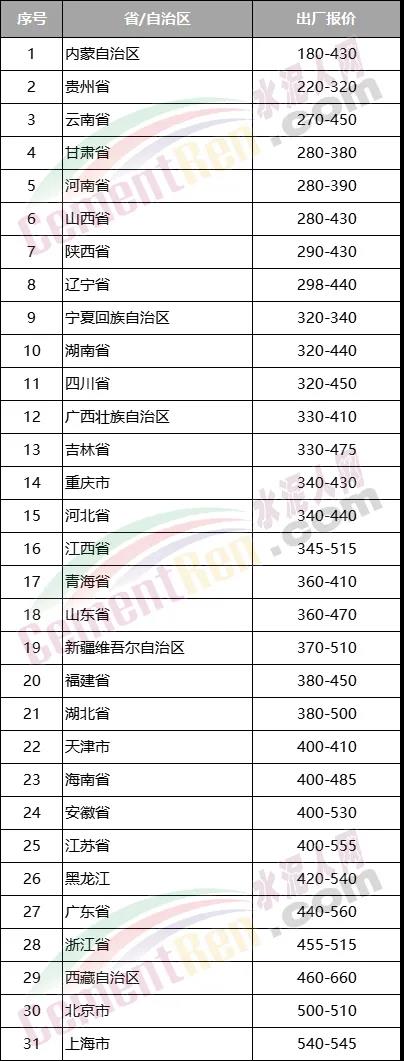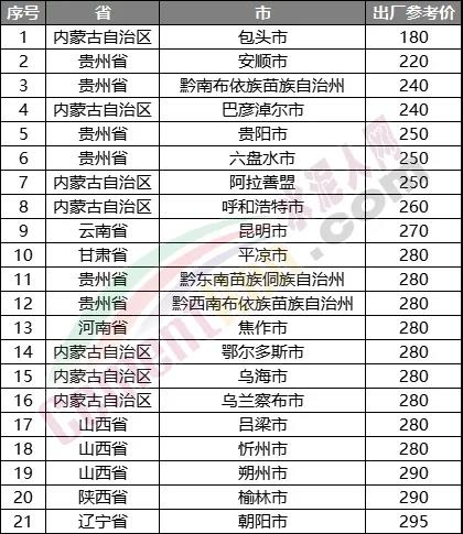截止目前,水泥報(bào)價(jià)仍處于300元/噸以下的企業(yè)分布在甘肅省平?jīng)鍪?、貴州省安順市、貴陽(yáng)市、六盤(pán)水市、黔東南苗族侗族自治州、黔南布依族苗族自治州、黔西南布依族苗族自治州;內(nèi)蒙古自治區(qū)阿拉善盟、巴彥淖爾市、包頭市、鄂爾多斯市、呼和浩特市、烏海市、烏蘭察布市;山西省呂梁市、朔州市、忻州市以及陜西省榆林市、云南省昆明市、河南省焦作市;遼寧省朝陽(yáng)市等20多個(gè)地區(qū)。