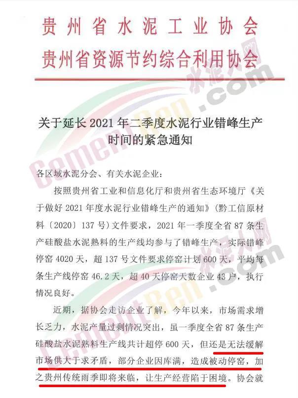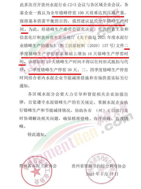 為此,經(jīng)錯(cuò)峰生產(chǎn)委員會(huì)研究決定,在貴州省工業(yè)和信息化廳和貴州省生態(tài)環(huán)境廳《關(guān)于做好2021年度水泥行業(yè)錯(cuò)峰生產(chǎn)的通知》(黔工信原材料〔2020)137號(hào))文件二季度錯(cuò)峰生產(chǎn)停窯要求基礎(chǔ)上增加10天錯(cuò)峰生產(chǎn)停密時(shí)間,該增加的10天錯(cuò)峰生產(chǎn)時(shí)間不得以任何形式抵扣與代停,二季度錯(cuò)峰生產(chǎn)停窯30天。