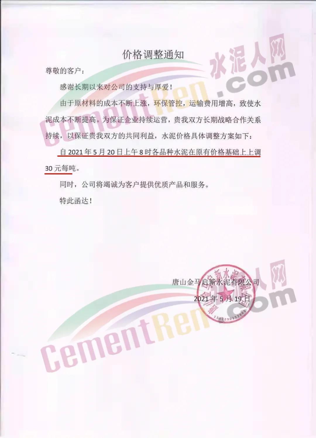 19日,唐山金馬啟新永泥有限公司通知,由于原材料的成本不斷上漲,環(huán)保管控,運輸費用增高,致使水泥成本不斷提高。自2021年5月20日上午8時起各品種水泥在原有價格基礎(chǔ)上上調(diào)30元/噸。