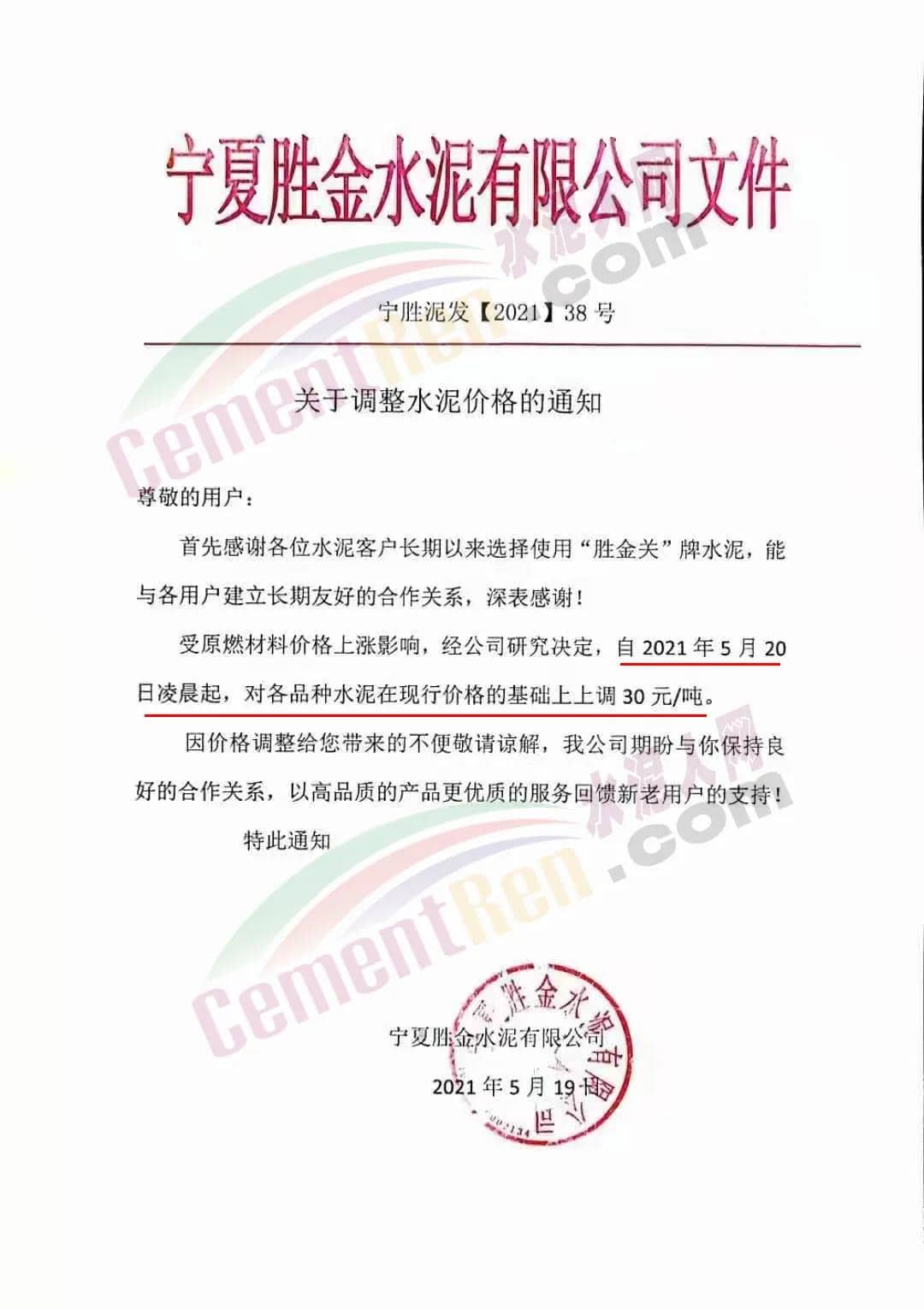 寧夏勝金水泥通知,5月20日起對各品種水泥上調(diào)30元/噸。