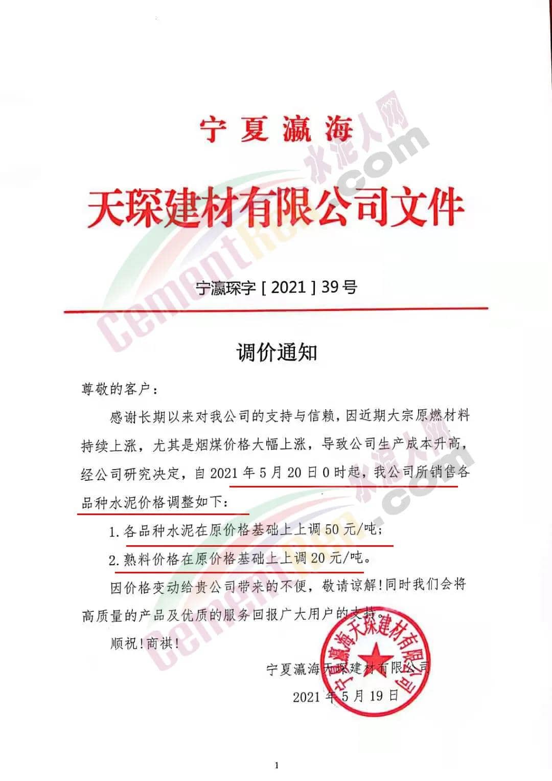 寧夏瀛海天琛建材有限公司通知自5月20日起,上調(diào)各品種水泥價格50元/噸,熟料價格上調(diào)20元/噸。