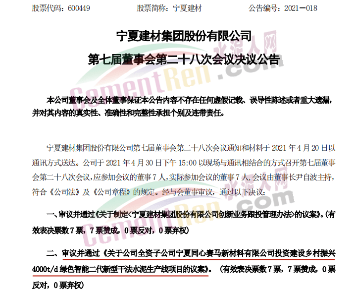 近日,寧夏建材公布公司第七屆董事會第二十八次會議決議,審議并通過關(guān)于公司全資子公司寧夏同心賽馬新材料有限公司投資建設鄉(xiāng)村振興4000t/d綠色智能二代新型干法水泥生產(chǎn)線項目的議案。一條年產(chǎn)124萬噸的智能化水泥熟料生產(chǎn)線將開建!