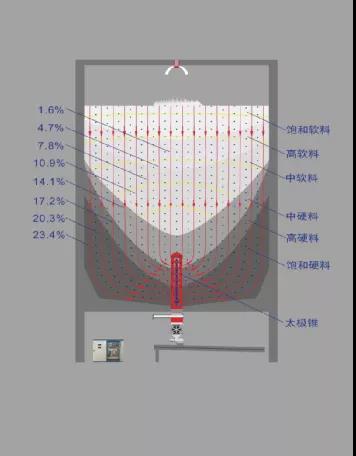 太極錐的結(jié)構(gòu)與硬軟料的自然分層形成逐級(jí)對(duì)應(yīng),保證底部硬料最優(yōu)先進(jìn)入,最外層硬料對(duì)應(yīng)最底層入口,中心最軟料被自然對(duì)應(yīng)在最高層入口,運(yùn)行時(shí)只要卸料,太極錐內(nèi)的料重產(chǎn)生下拉真空吸附力F吸(約有1-2噸重),與錐外的料位垂直重力疊加擠推力F重,里應(yīng)外合共同作用,破除其收縮拱而產(chǎn)生持續(xù)進(jìn)料流動(dòng):