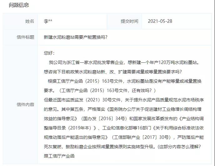 日前,李**在工信部網(wǎng)站提問”新建水泥粉磨產(chǎn)站需要產(chǎn)能置換嗎?“。信件內(nèi)容中提到,其公司為浙江省一家水泥批發(fā)零售企業(yè),想新建一個(gè)年產(chǎn)120萬噸水泥粉磨站。想咨詢下目前政策水泥粉磨站新、改、擴(kuò)建是否需要減量或等量置換。并提到根據(jù)工信廳產(chǎn)業(yè)函(2015)163號(hào)文件,水泥粉磨站沒有產(chǎn)能等量或減量置換要求。最近相關(guān)文 件提出嚴(yán)防落后產(chǎn)能死灰復(fù)燃,鼓勵(lì)粉磨企業(yè)按照減量置換原則實(shí)施轉(zhuǎn)型升級(jí),又如何理解?
