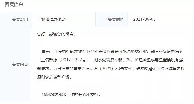 6月3日,工信部答復(fù)稱,目前,正在執(zhí)行的水泥行業(yè)產(chǎn)能置換政策是《水泥玻璃行業(yè)產(chǎn)能置換實(shí)施辦法》(工信部原〔2017〕337號(hào)),對(duì)水泥粉磨站新、改、擴(kuò)建減量或等量置換沒有強(qiáng)制要求。近日發(fā)布的國(guó)市監(jiān)質(zhì)監(jiān)發(fā)(2021)30號(hào)文件,鼓勵(lì)粉磨企業(yè)按照減量置換原則實(shí)施轉(zhuǎn)型升級(jí)。