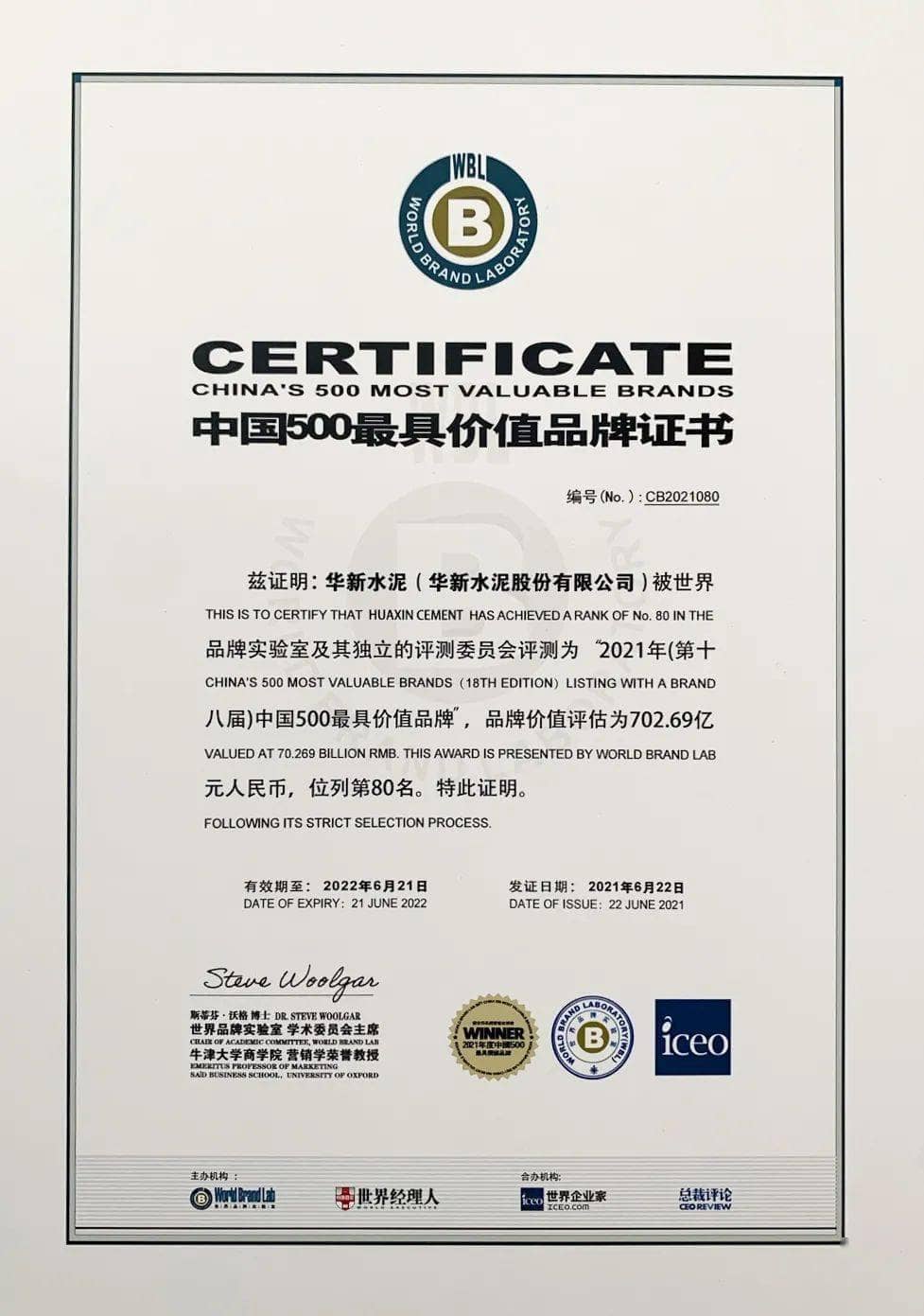 6月22日,由世界品牌實(shí)驗(yàn)室(WorldBrandLab)主辦的第十八屆“世界品牌大會”在北京舉行,會上發(fā)布了2021年《中國500最具價值品牌》榜單,華新水泥以702.69億元的品牌價值位列榜單第80位,較去年上漲了103.94億元,這是華新連續(xù)第九年上榜。