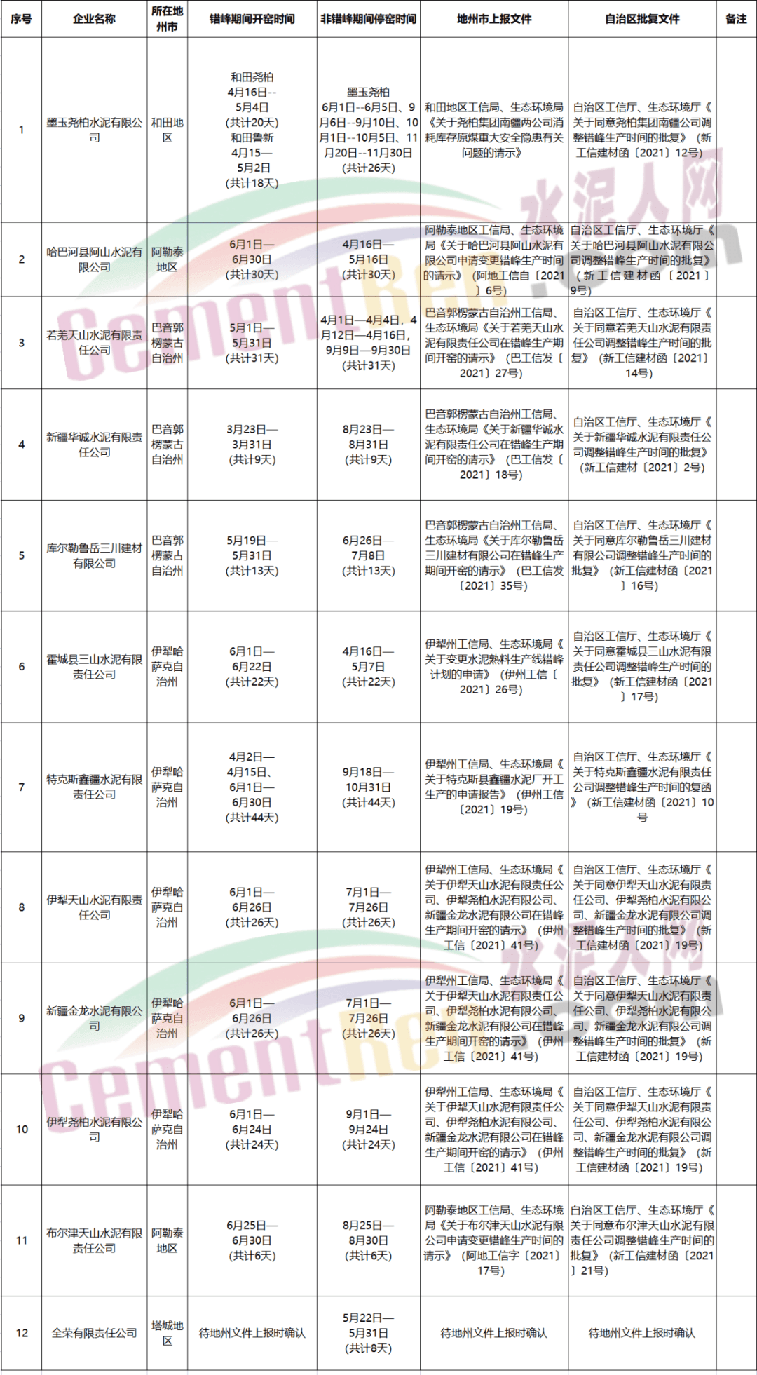 日前,新疆維吾爾自治區(qū)工業(yè)和信息化廳發(fā)布《2020-2021年調(diào)整錯(cuò)峰生產(chǎn)時(shí)間水泥熟料生產(chǎn)企業(yè)名單(第二批)》稱,按照要求,現(xiàn)將墨玉堯柏水泥有限公司、哈巴河縣阿山水泥有限公司、若羌天山水泥有限責(zé)任公司等12家水泥企業(yè)錯(cuò)峰時(shí)間變更情況予以公告,具體公告如下: