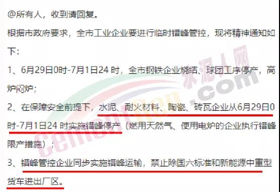 在保障安全前提下,水泥、耐火材料、陶瓷、磚瓦企業(yè)從6月29日0時(shí)-7月1日24時(shí)實(shí)施錯(cuò)峰停產(chǎn);錯(cuò)峰管控企業(yè)同步實(shí)施錯(cuò)峰運(yùn)輸,禁止除國(guó)六標(biāo)準(zhǔn)和新能源中重型貨車進(jìn)出廠區(qū)。