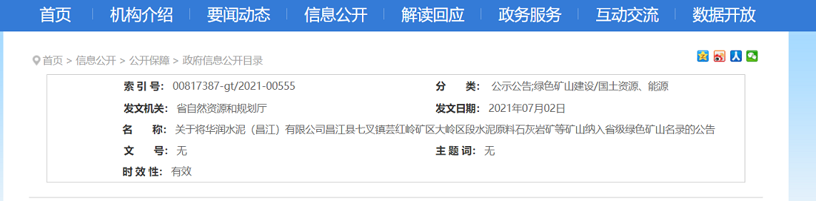 華潤水泥有一礦山納入省級綠色礦山名錄!