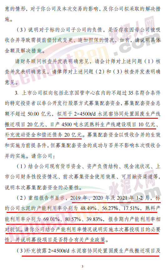 上市公司擬向包括北京國(guó)管中心在內(nèi)的不超過(guò)35名符合條件的特定投資者以非公開(kāi)發(fā)行股票方式募集配套資金,募集配套資金總額不超過(guò)50.00億元,擬用于2×4500t/d水泥窯協(xié)同處置固廢生產(chǎn)線搬遷項(xiàng)目20億元、日產(chǎn)4500噸水泥熟料生產(chǎn)線建設(shè)項(xiàng)目10億元、補(bǔ)充流動(dòng)資金和償還債務(wù)20億元。募集配套資金以吸收合并的生效和實(shí)施為前提條件,但募集配套資金的成功與否并不影響本次吸收合并的實(shí)施。請(qǐng)公司: