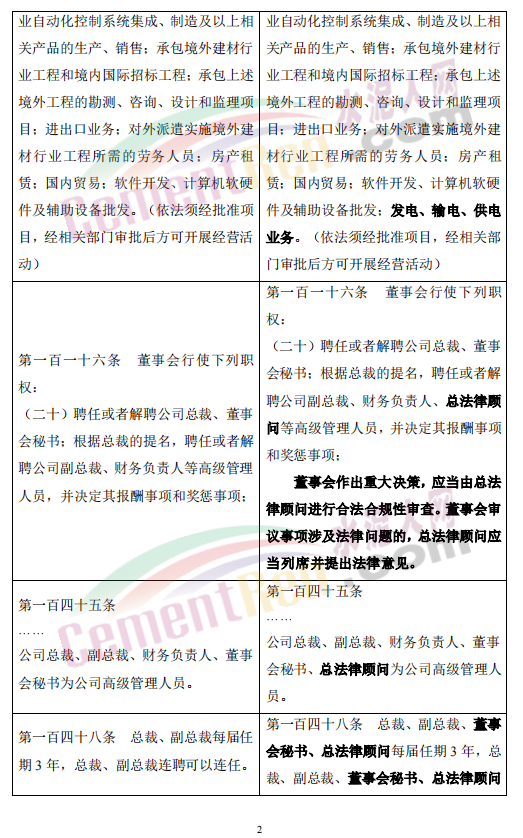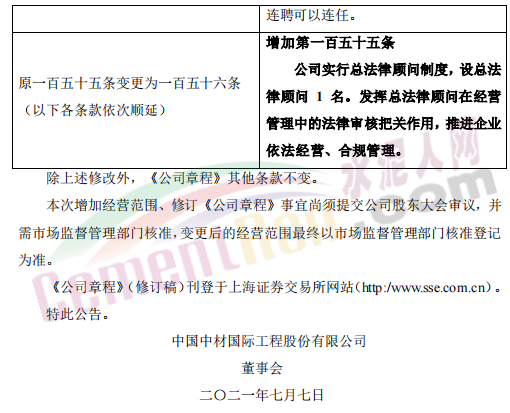 7月6日,中國中材國際工程股份有限公司發(fā)布《關(guān)于增加經(jīng)營范圍、修訂公司<章程>的公告》稱,公司擬增加電力相關(guān)經(jīng)營范圍并修訂《公司章程》相關(guān)條款。具體情況為: