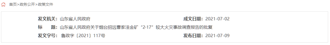 據(jù)山東省政府網(wǎng)站7月9日消息,山東省人民政府發(fā)布關(guān)于煙臺(tái)招遠(yuǎn)曹家洼金礦“2·17”較大火災(zāi)事故調(diào)查報(bào)告的批復(fù)。2021年2月17日6時(shí)許,山東煙臺(tái)招遠(yuǎn)市夏甸鎮(zhèn)曹家洼金礦在設(shè)備檢修時(shí)發(fā)生火災(zāi)。截至2月17日17時(shí),井下搜救工作結(jié)束。此次事故共造成6人遇難,4人成功升井。