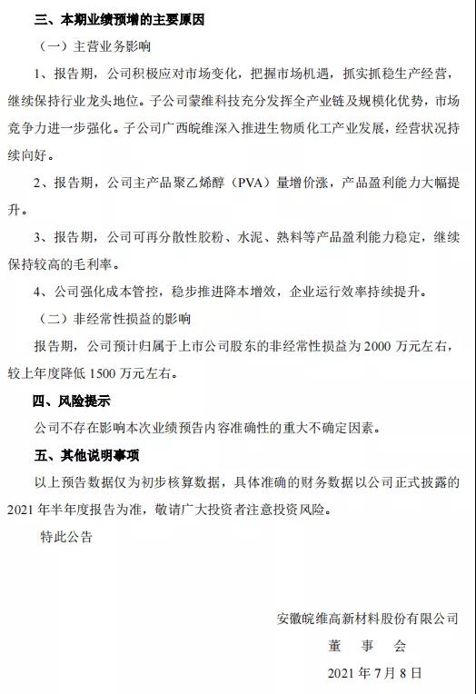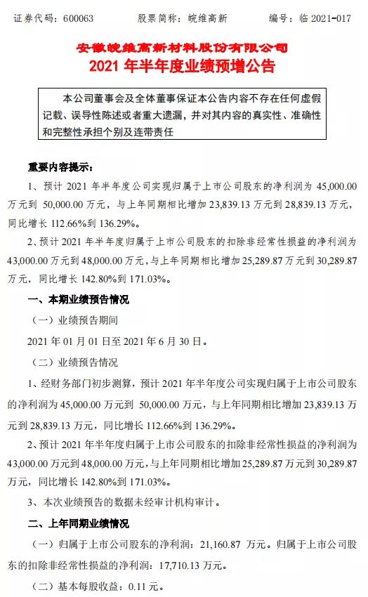7月7日,皖維高新(600063)發(fā)布2021年半年度業(yè)績預(yù)告:預(yù)計(jì)2021年半年度公司實(shí)現(xiàn)歸屬于上市公司股東的凈利潤為4.5億元到5億元,與上年同期相比增加2.3億元到2.8億元,同比增長112.66%到136.29%。