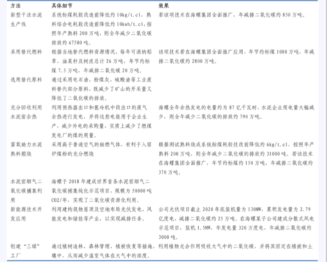 以海螺水泥為例,公司通過一系列手段降低碳排放實(shí)現(xiàn)碳中和,2020年預(yù)期將噸熟料二氧化碳排放較2016年減少0.004噸,2025年預(yù)期將噸熟料二氧化碳排放較2020年下降0.0031噸。同時(shí)引進(jìn)新技術(shù)將二氧化碳廢氣轉(zhuǎn)化為二氧化碳產(chǎn)品。根據(jù)水泥網(wǎng)報(bào)道,海螺水泥通過一系列手段降低碳排放實(shí)現(xiàn)碳中和。如新型干法水泥生產(chǎn)線、富氧助力水泥熟料煅燒和水泥窯煙氣二氧化碳捕集利用等方法。其中水泥窯煙氣二氧化碳捕集利用技術(shù)擁有世界首條水泥窯煙氣二氧化碳捕集純化示范項(xiàng)目,規(guī)模為50000噸CO2/年,實(shí)現(xiàn)了二氧化碳資源化利用。