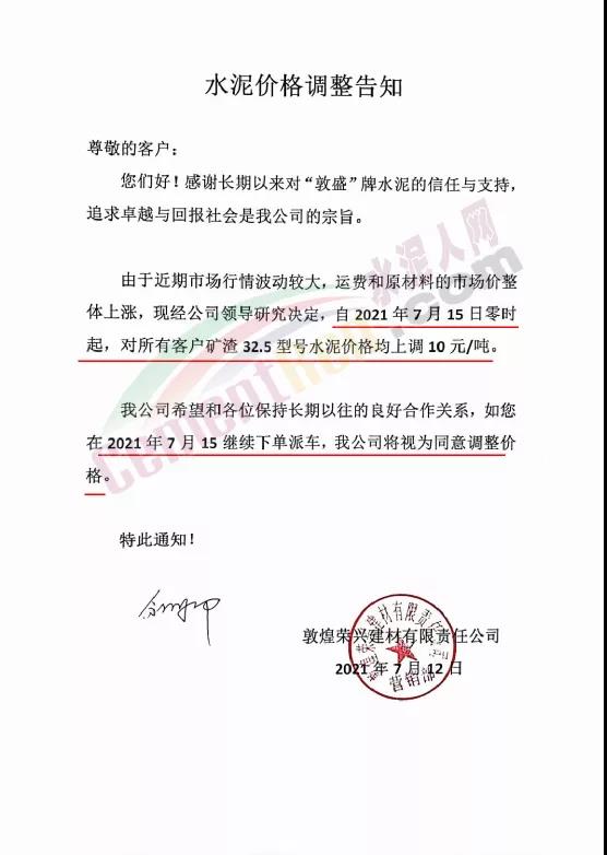 日前敦煌榮興建材有限責任公司通知由于近期市場行情波動較大,運費和原材料的市場價整體上漲,經(jīng)公司研究決定自7月15日零時起對所有客戶礦渣32.5型號水泥價格上調(diào)10元/噸。如客戶在調(diào)價后繼續(xù)下單派車,公司將視為同意調(diào)整價格。