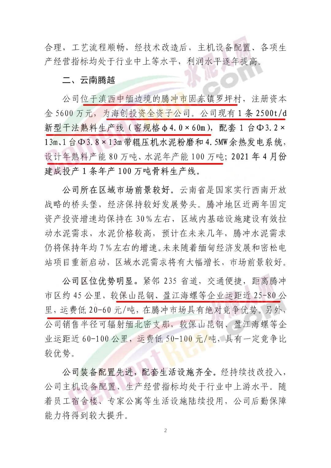 《情況介紹》提到安徽海螺創(chuàng)業(yè)投資有限責(zé)任公司旗下?lián)碛匈F州新雙龍水泥有限公司、騰沖市騰越水泥有限公司2家水泥公司,經(jīng)股東協(xié)商達(dá)成一致,擬將其下屬的貴州新雙龍和云南騰越100%股權(quán)公開對外出售或轉(zhuǎn)讓。